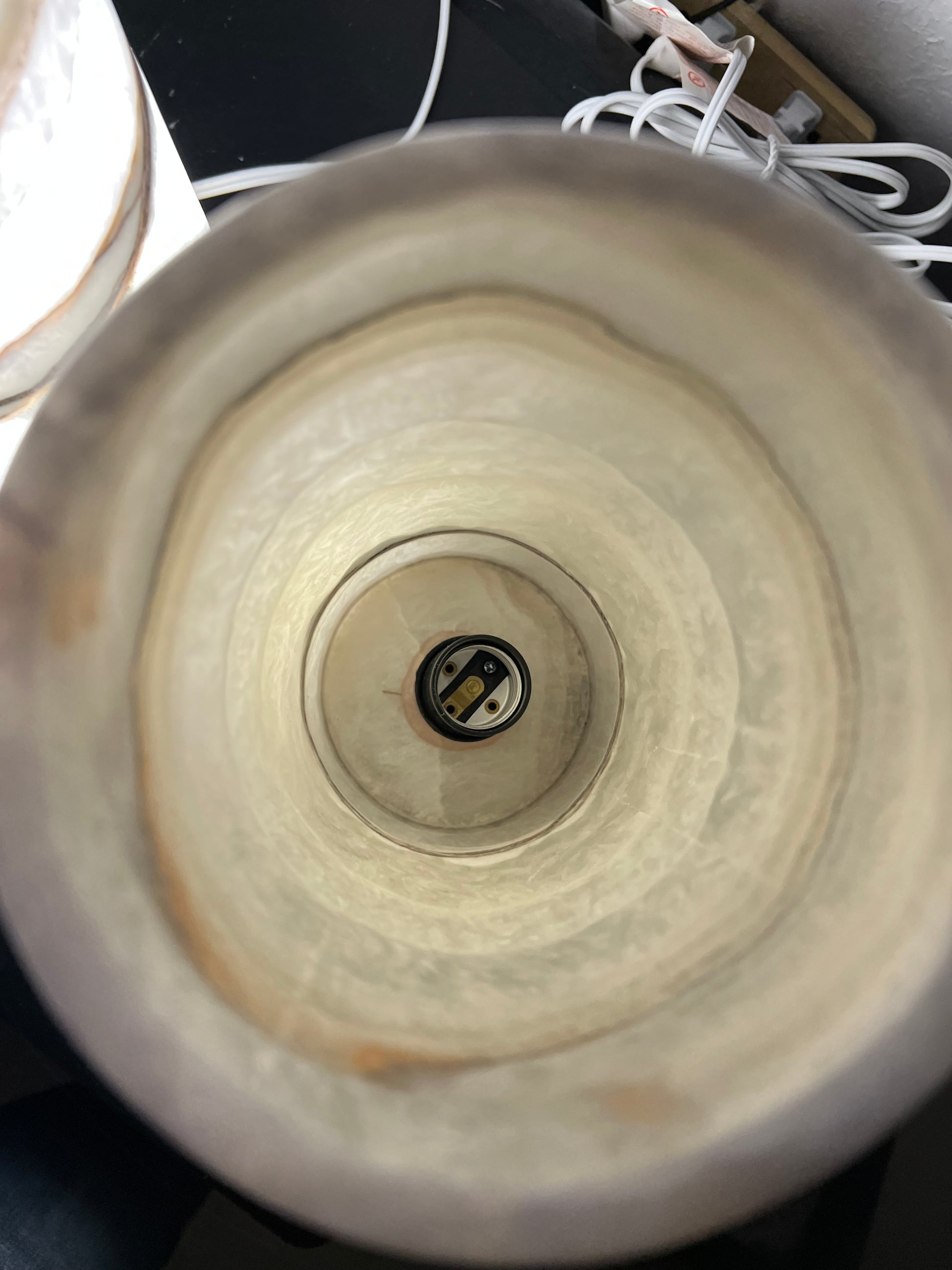 This size is perfect for a small space or desk or space. Each piece is unique It comes with LED bulb and white extension .