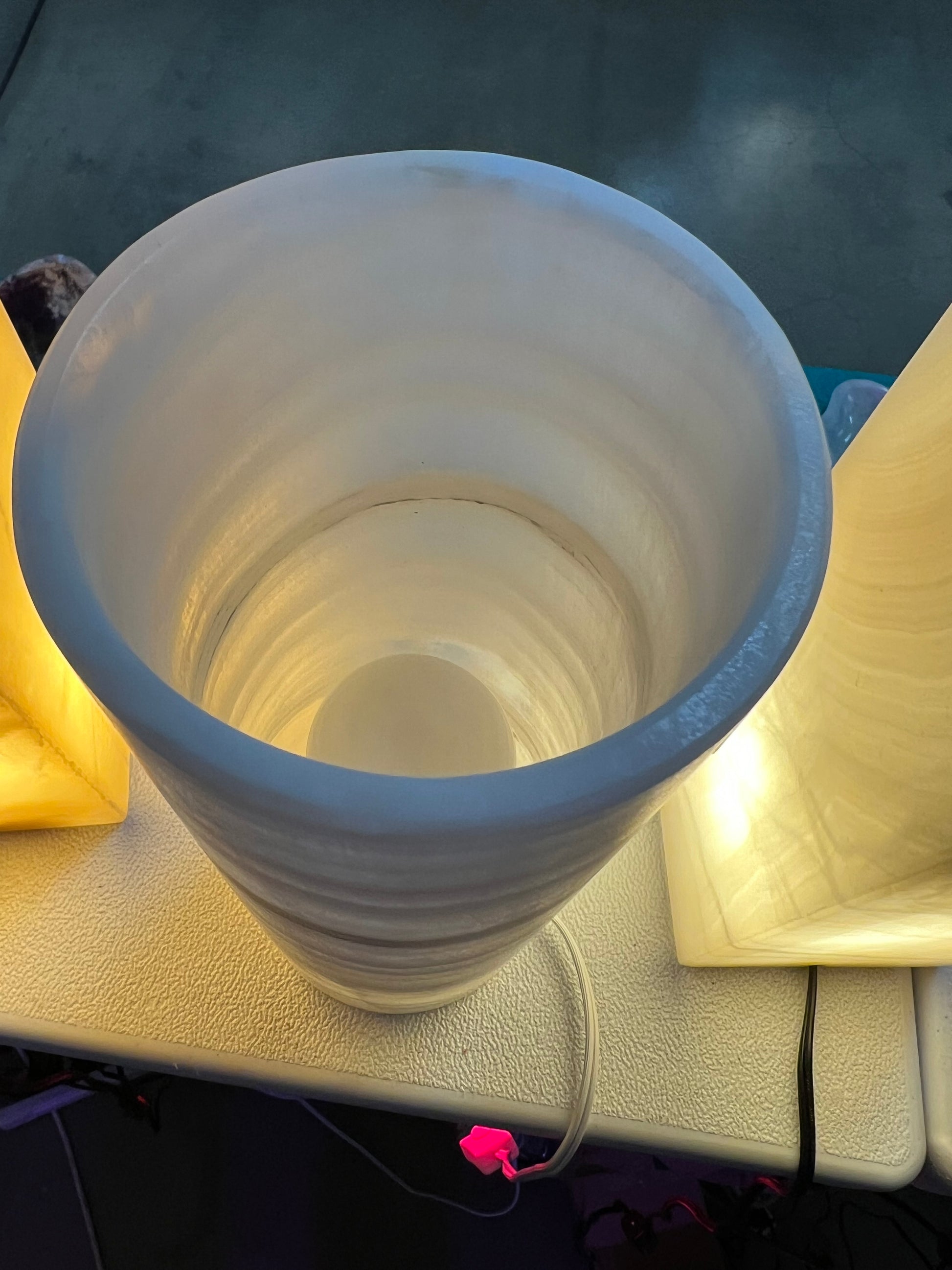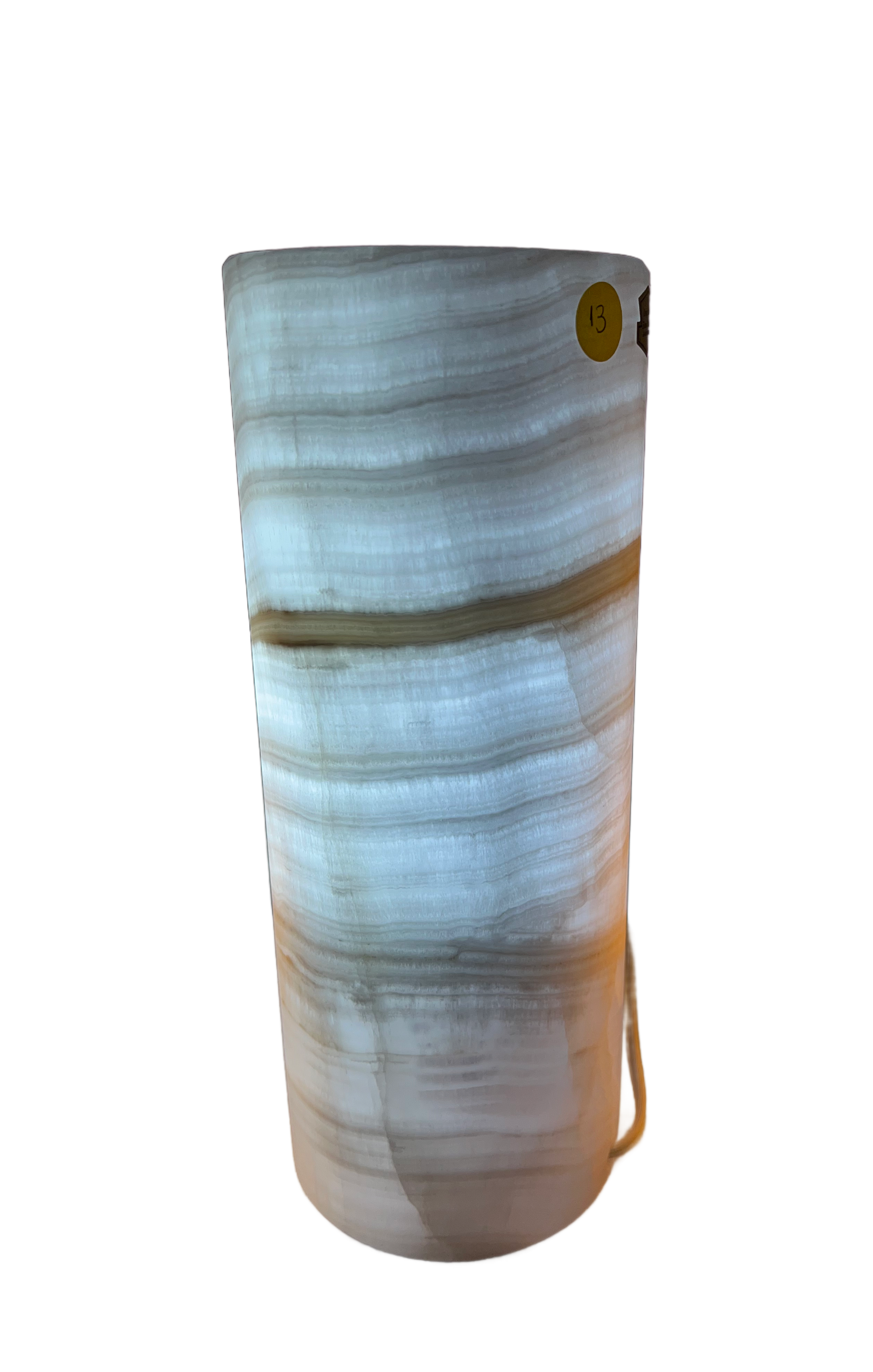 Make any space more elegant with this exquisite hand crafted cylinder shape lamp. Made of Translucent White Onyx from Mexico. You will enjoy the amazing natural patterns and streaks of one of the most elegant white onyx's mined in Mexico .Colors may include white,gray,ivory This size is perfect for a small space or desk or space. Each piece is unique It comes with LED bulb and white extension .
